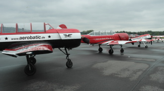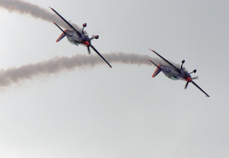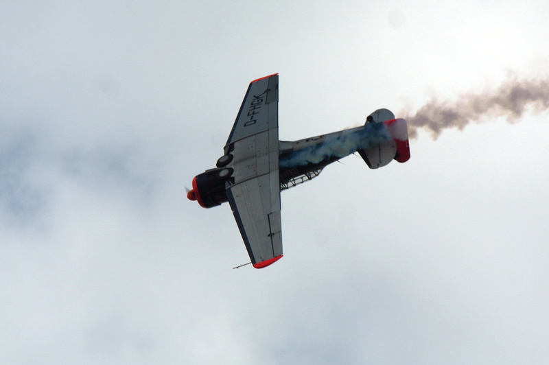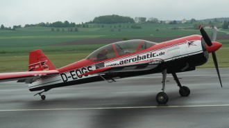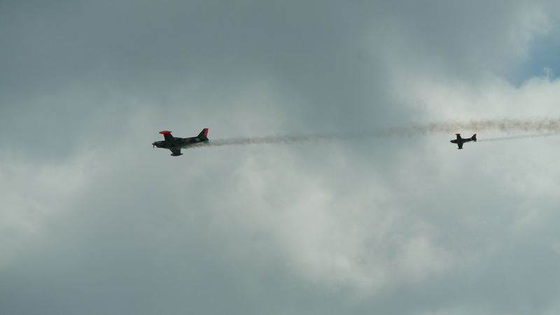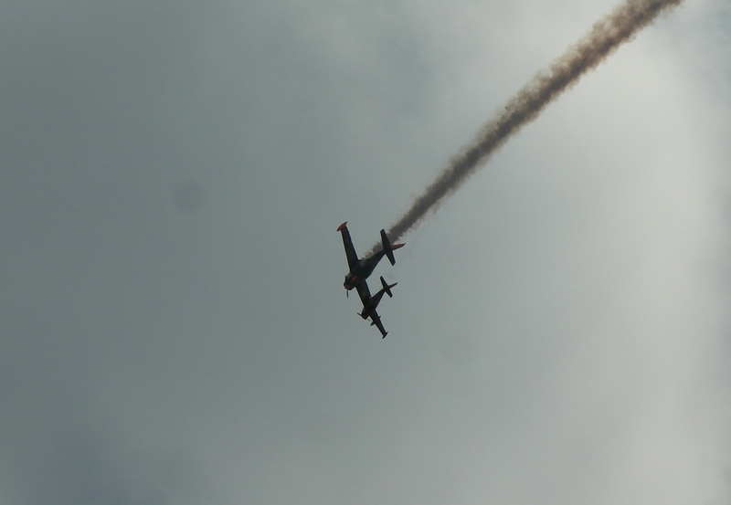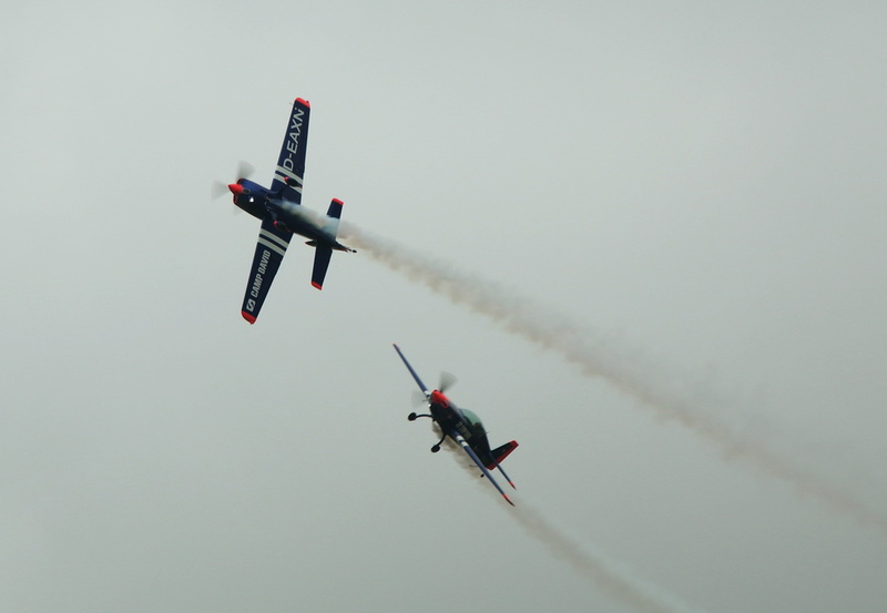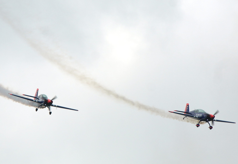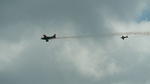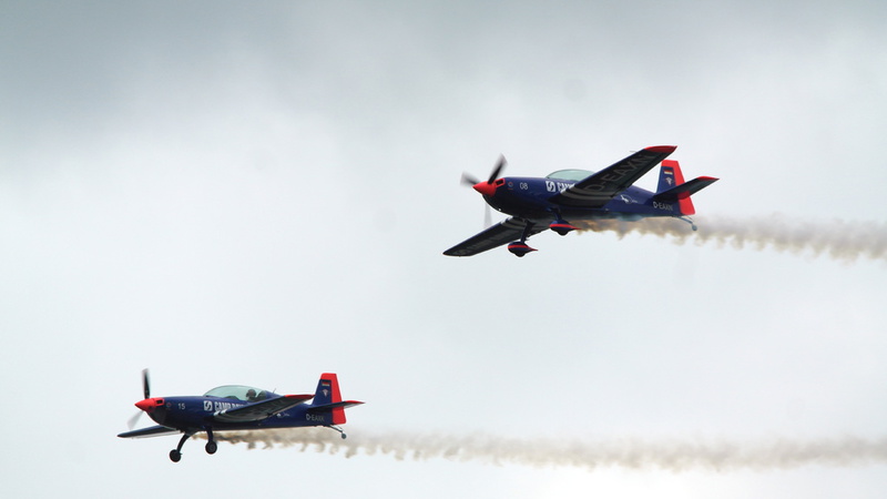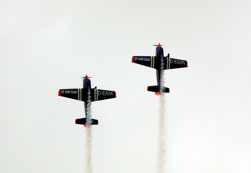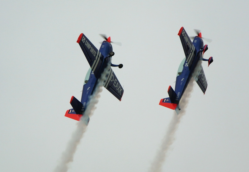 Zwei Extra 330 LT, die von den Piloten Toni und Walter Eichhorn geflogen werden, waren ein Höhepunkt bei der Kunstflugshow in Jahnsdorf. Diese Flugzeuge werden bei den Red Bull Air Races geflogen. Die beiden Piloten sind übrigens bei der Lufthansa angestellt und fliegen dort Verkehrsflugzeuge wie Boeing 747 und Airbus A320